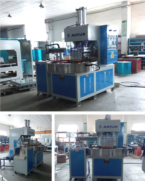 4、高周波熔斷機振蕩頻率符合標準,由高Q值真空電子管自激振蕩器產生高頻電磁場,使加工塑膠在上下電極間的高頻電場內,使其分子產生劇烈運動摩擦,在模具的壓力下得到其熔接效果。自動轉圓盤高周波熔斷機采用H型龍門結構,左右雙向自動滑臺,往返連續推送模具。