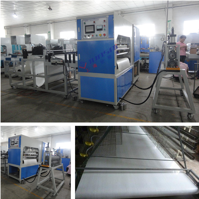 養殖傳送帶高周波熱合機,用電子管自激震蕩器產生一個高頻電場施加在電極上,被加工塑料在上、下電極間的高頻電場作用下,其內部分子產生熔化現象而自身產生熱量,在壓力的作用下達到熱熔的目。