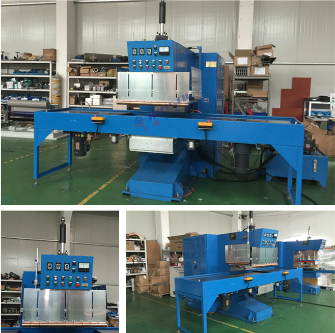 通過(guò)人工放料,高周波自動(dòng)熱合壓邊切熔,定型,工作時(shí)通過(guò)人工放料,放入模具位置上,按起動(dòng)開關(guān),底部模具滑板自動(dòng)滑動(dòng)到固定工作位置,機(jī)頭氣缸驅(qū)動(dòng)工模下降,通過(guò)延時(shí)預(yù)熱、高周熔接、切斷、定型,定型完畢機(jī)頭上升,底部工模滑板自動(dòng)滑出,人工取出成品。在生產(chǎn)中可自由設(shè)置各部時(shí)間,一般為3--6秒一個(gè)作業(yè)過(guò)程。